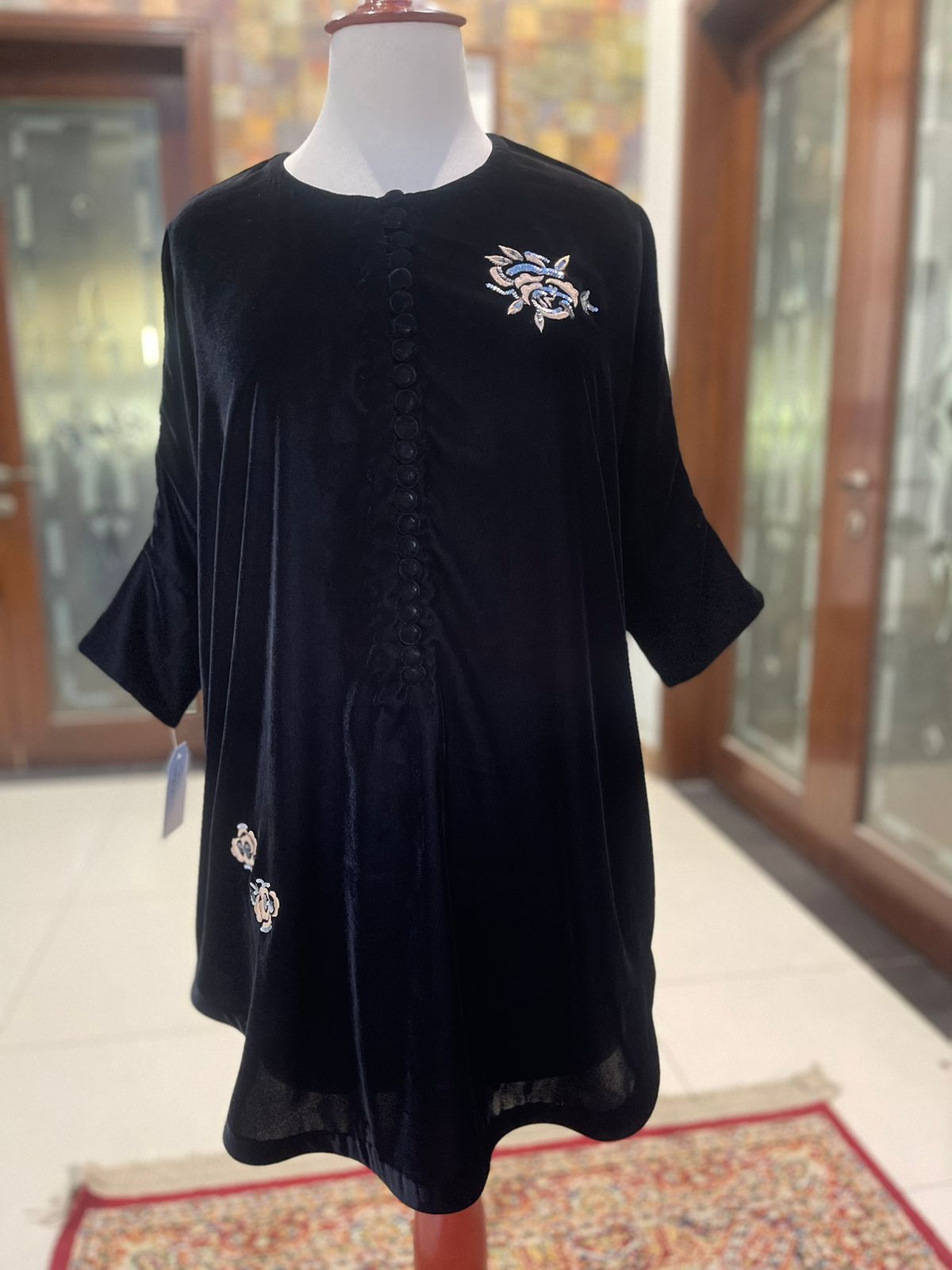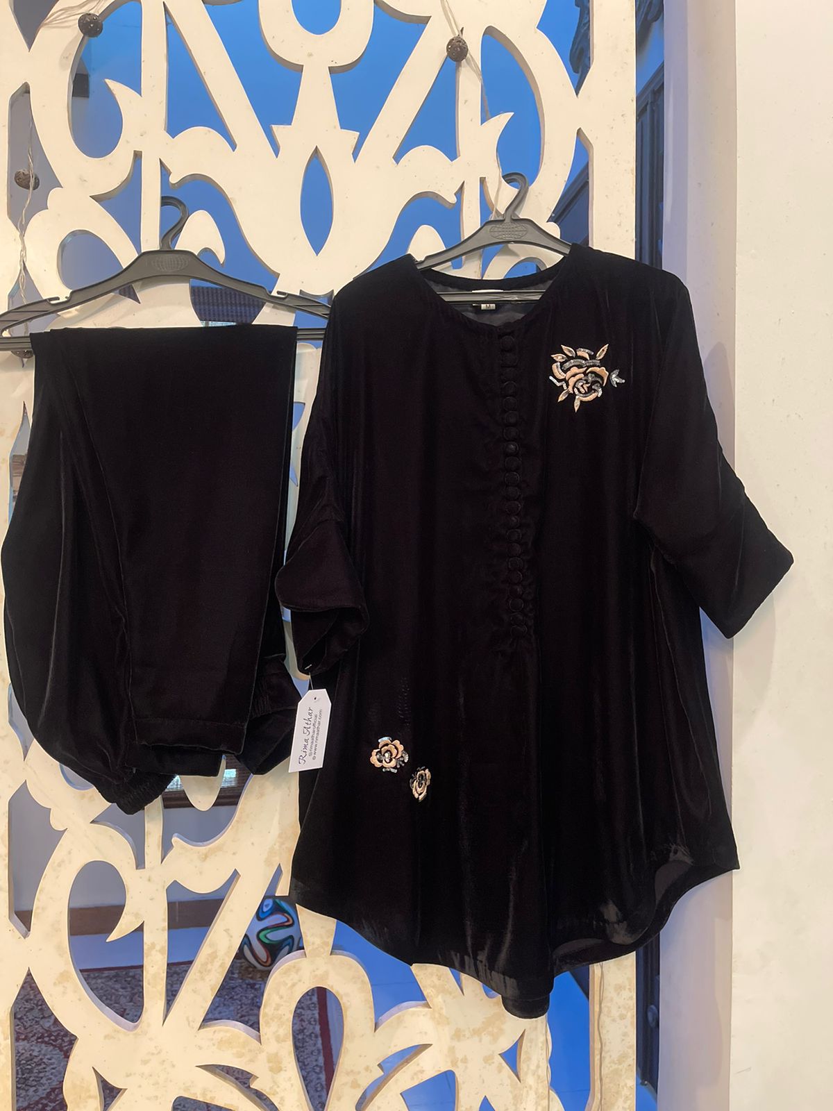 This stunning velvet ensemble features intricate resham and sequins work on the shirt, creating a beautiful fusion of texture and sparkle. The soft velvet fabric adds a luxurious touch, while the coordinating velvet trousers complete the refined look. This pret wear outfit is perfect for those seeking a blend of elegance and modern sophistication for any special occasion.