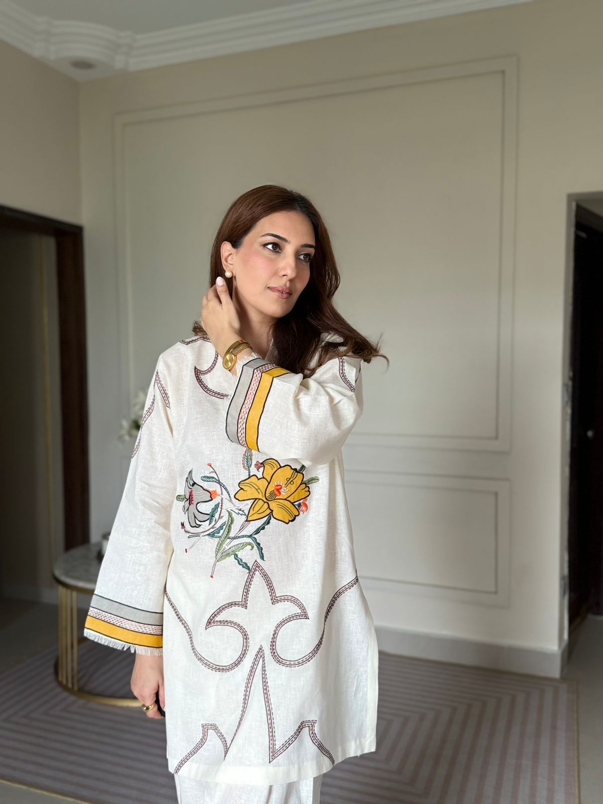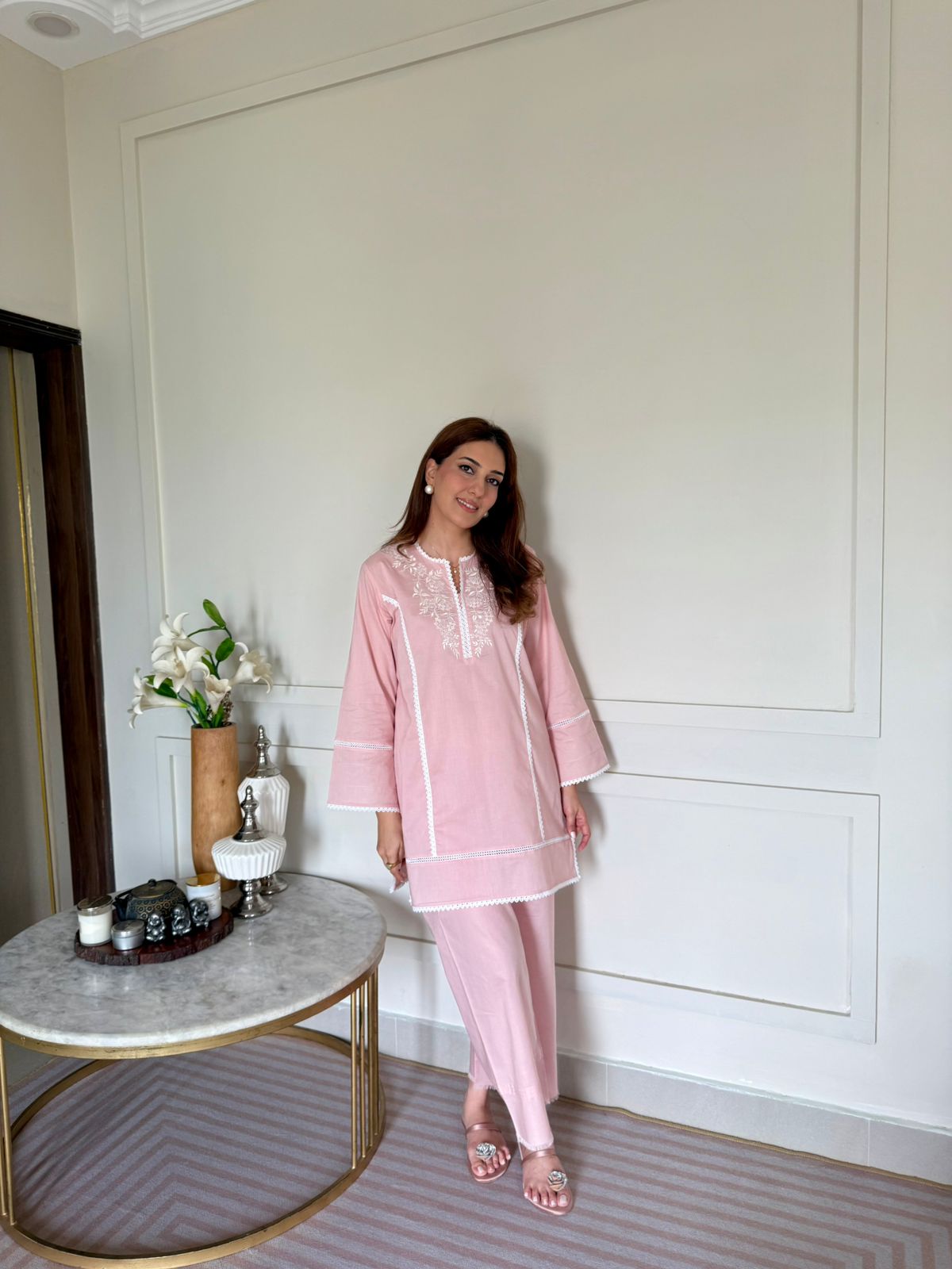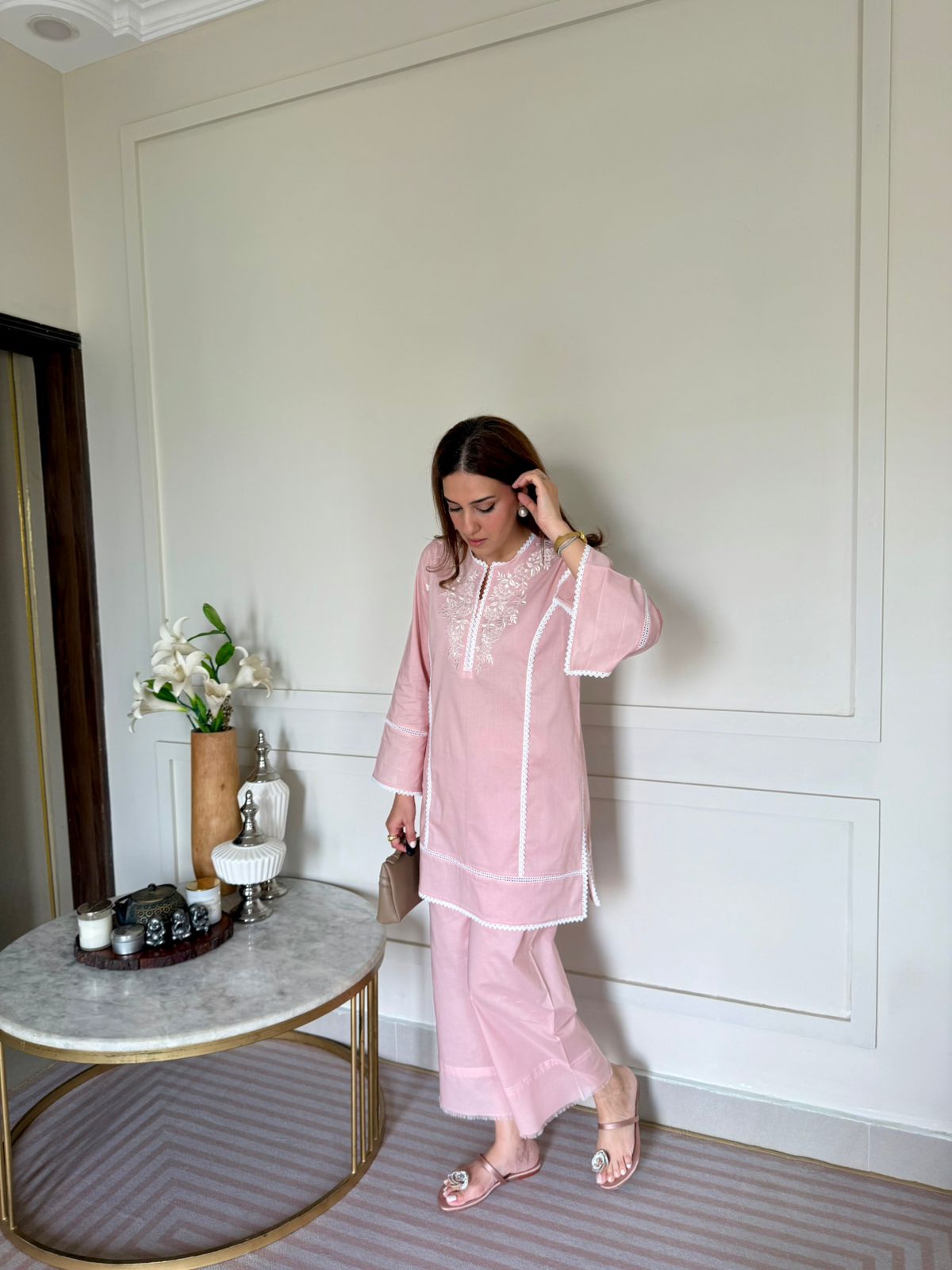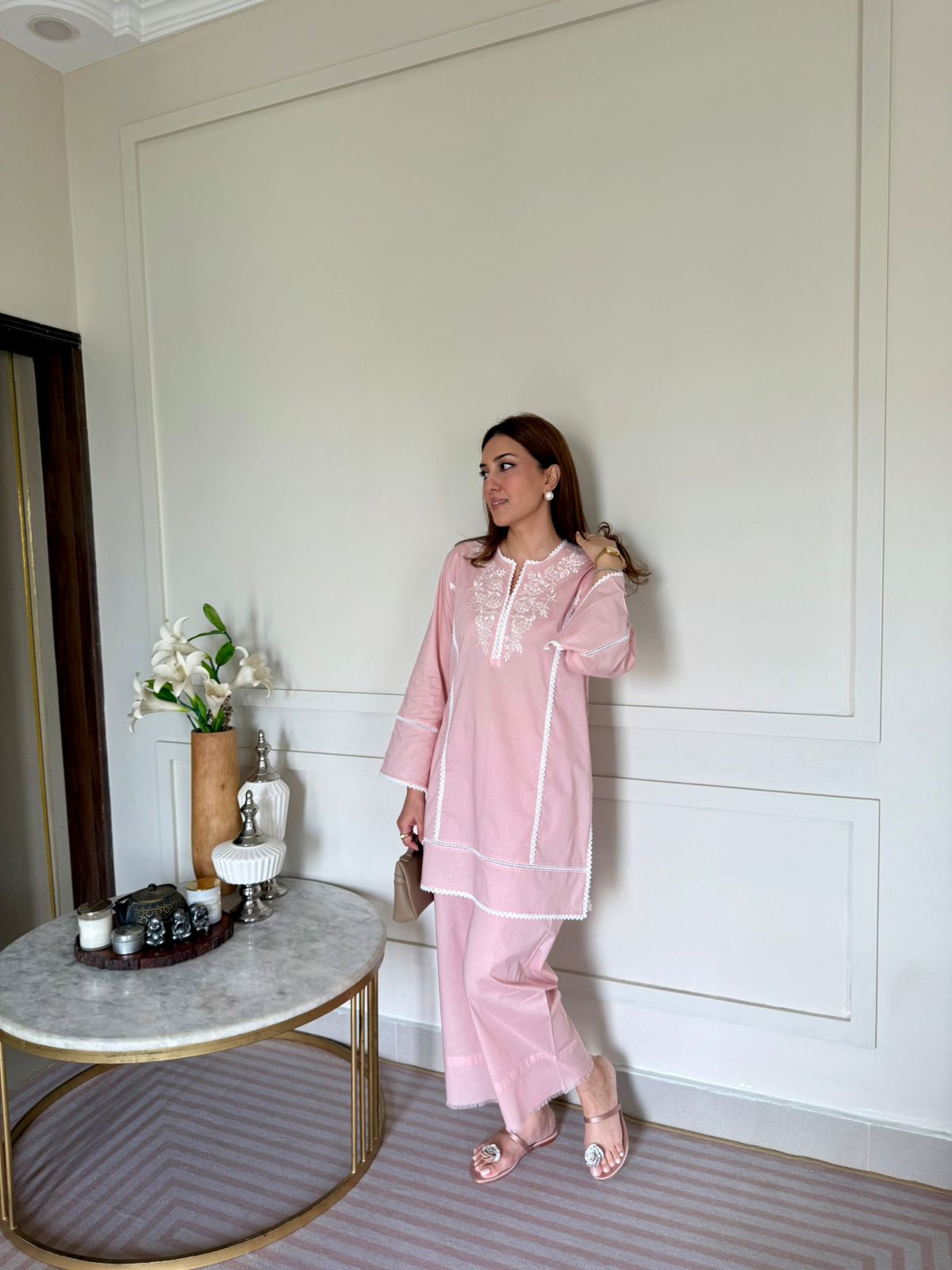 Embroidery on lawn neckline finished with lace and pleated sleeves and trouser