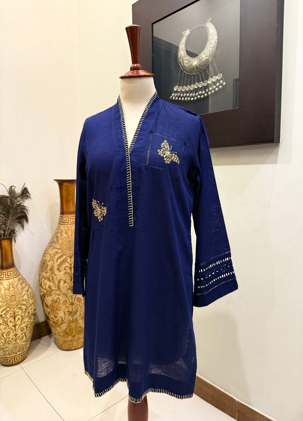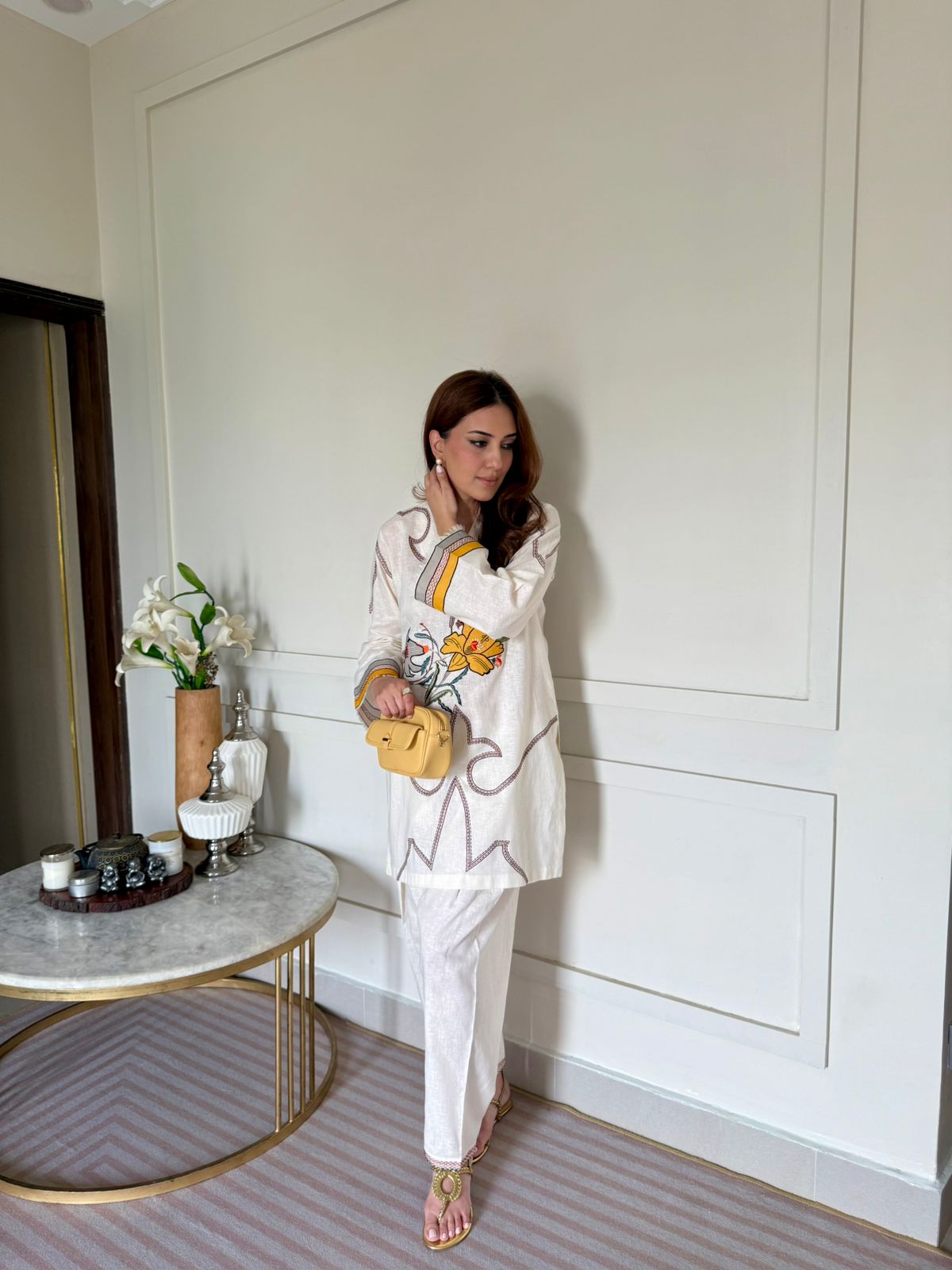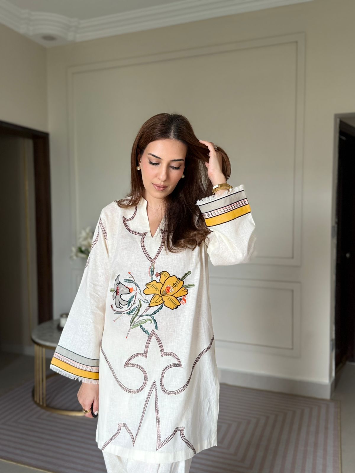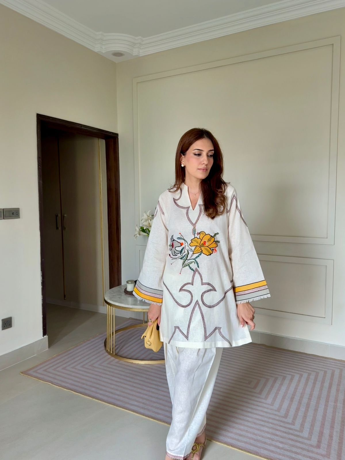 Very versatile embroidery floral appliqué work on soft irish shirt with beautiful resham tanka all over finished with organza