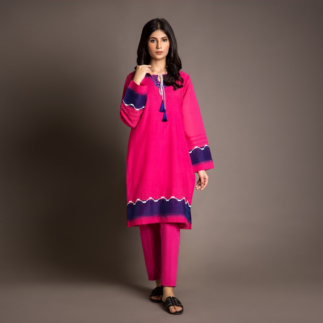Kurta on Karandi silk with hand embroidery neckline paired with plain pants.