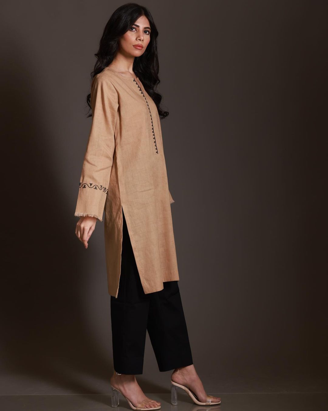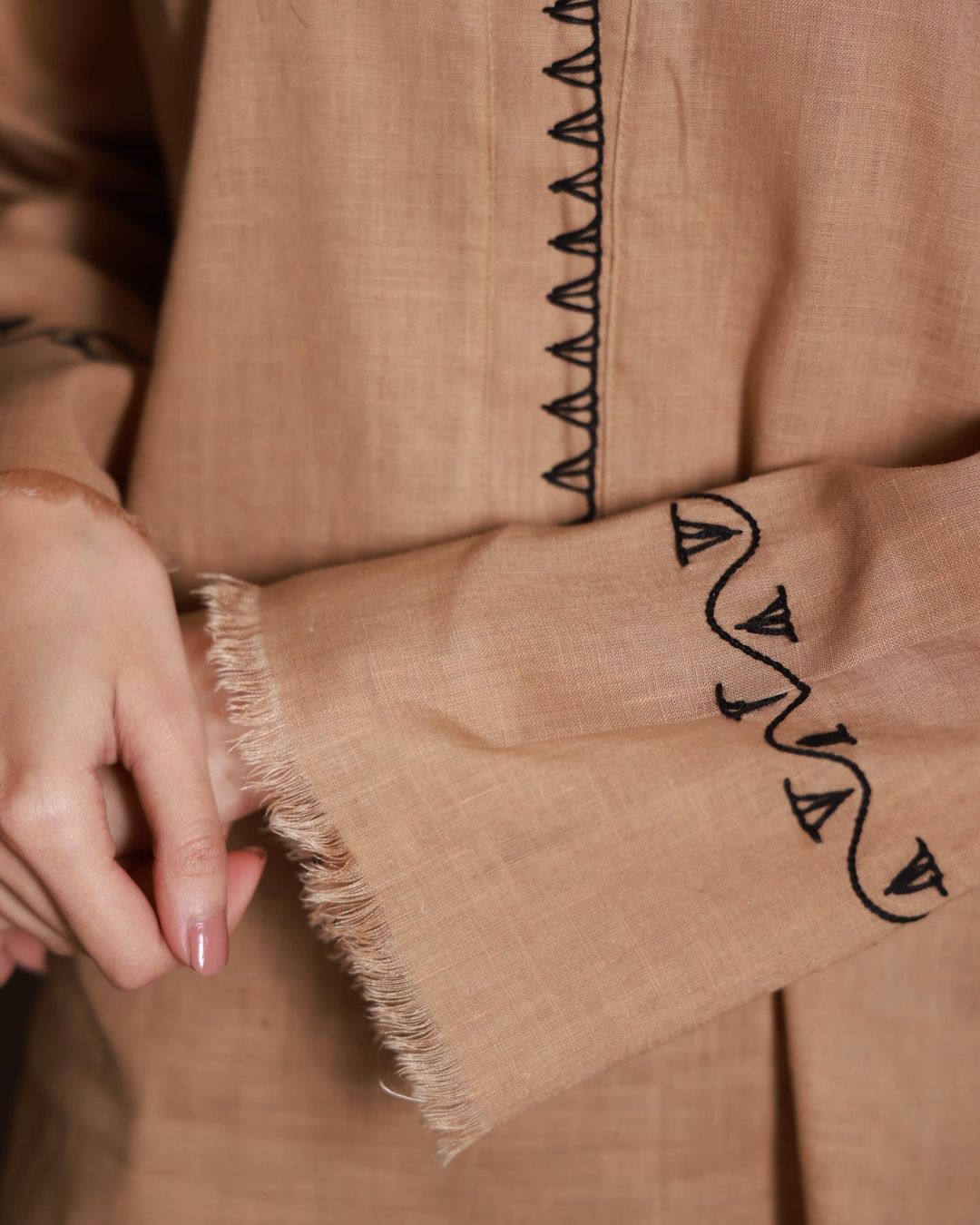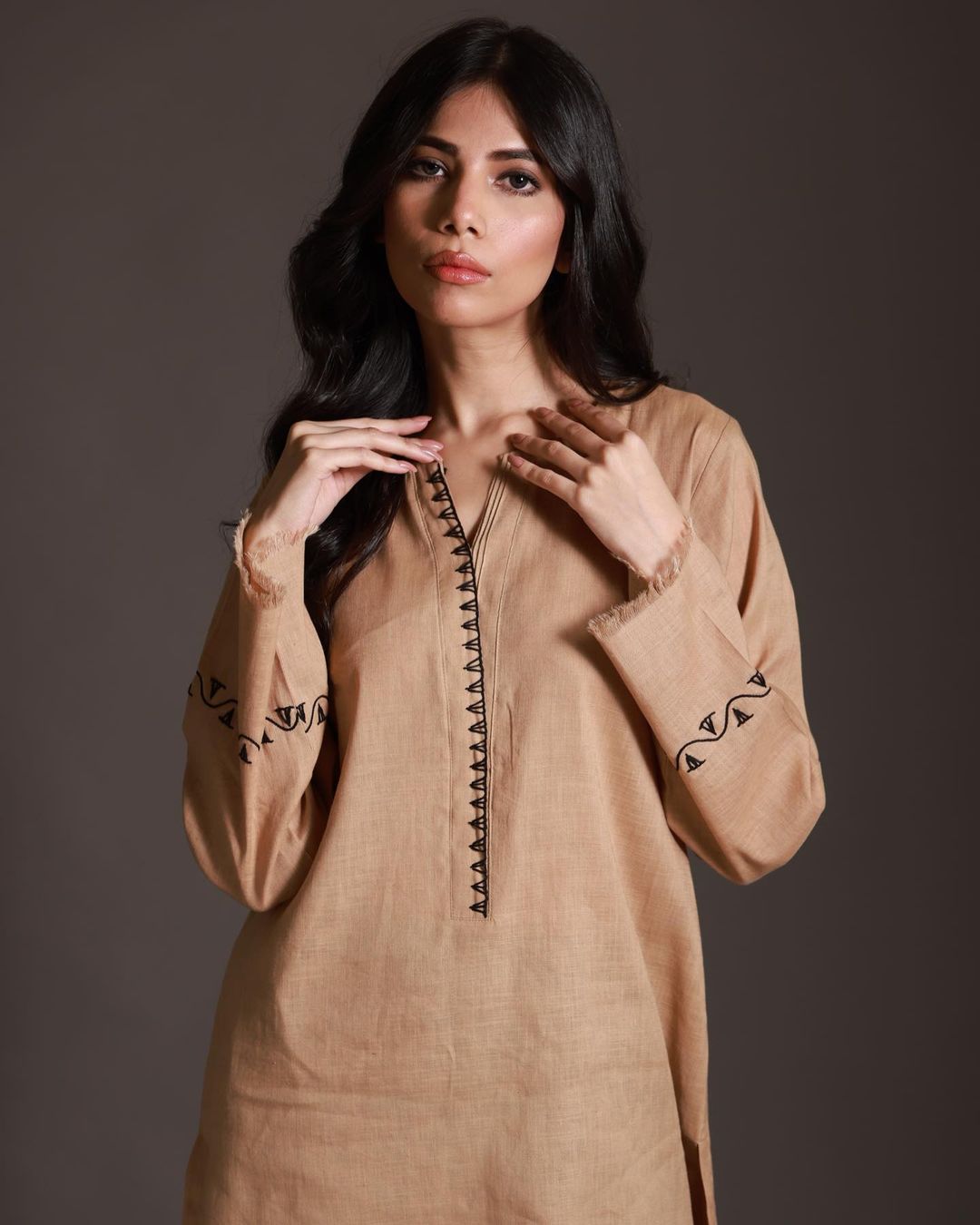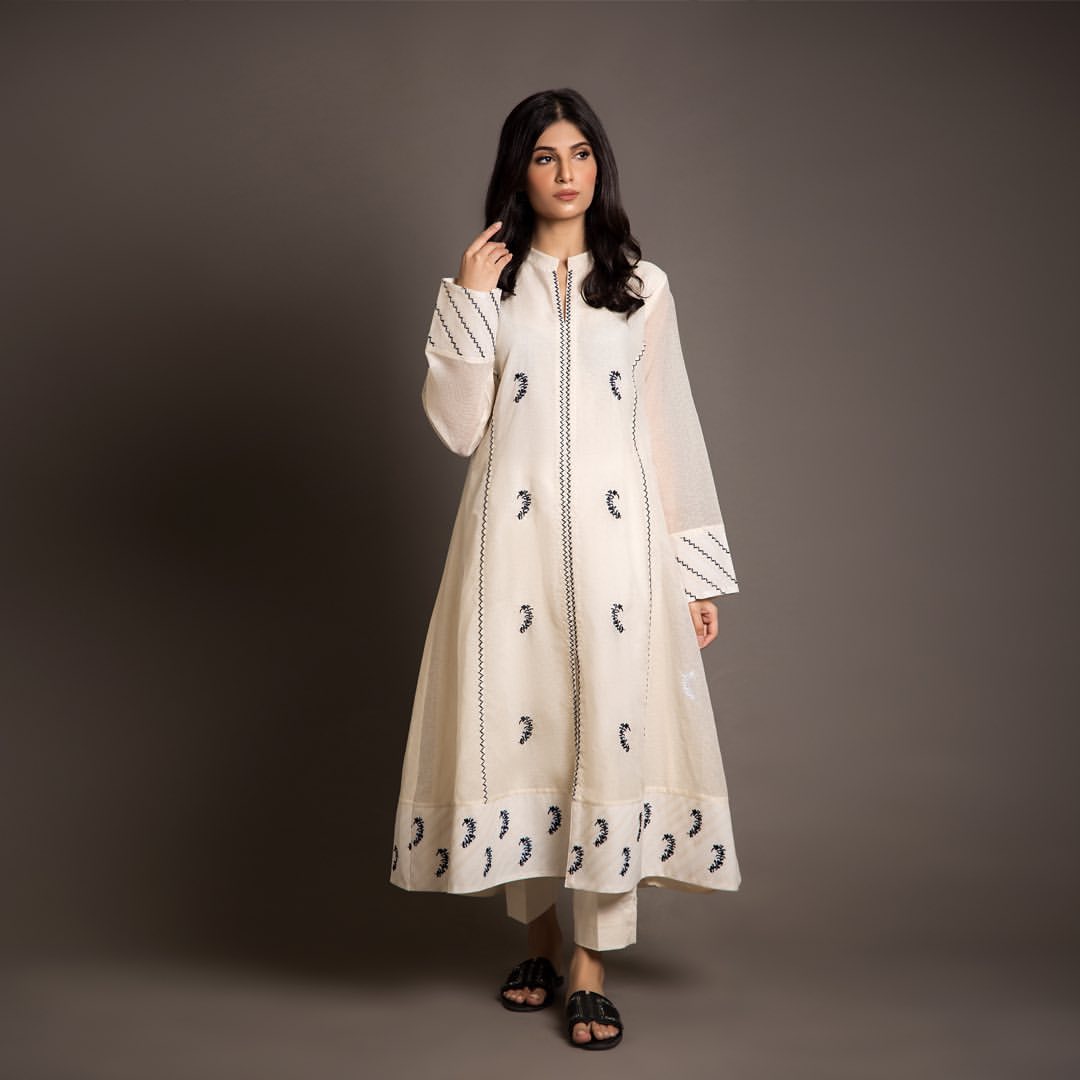 Shirt on pure irish lawn with hand embroidery paired with plain black pants.