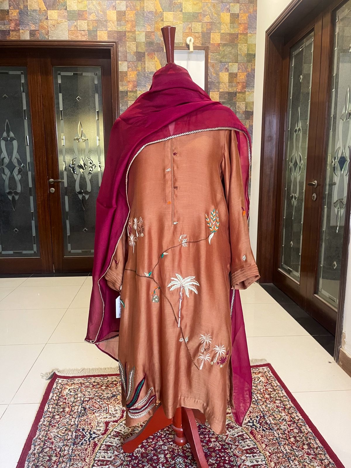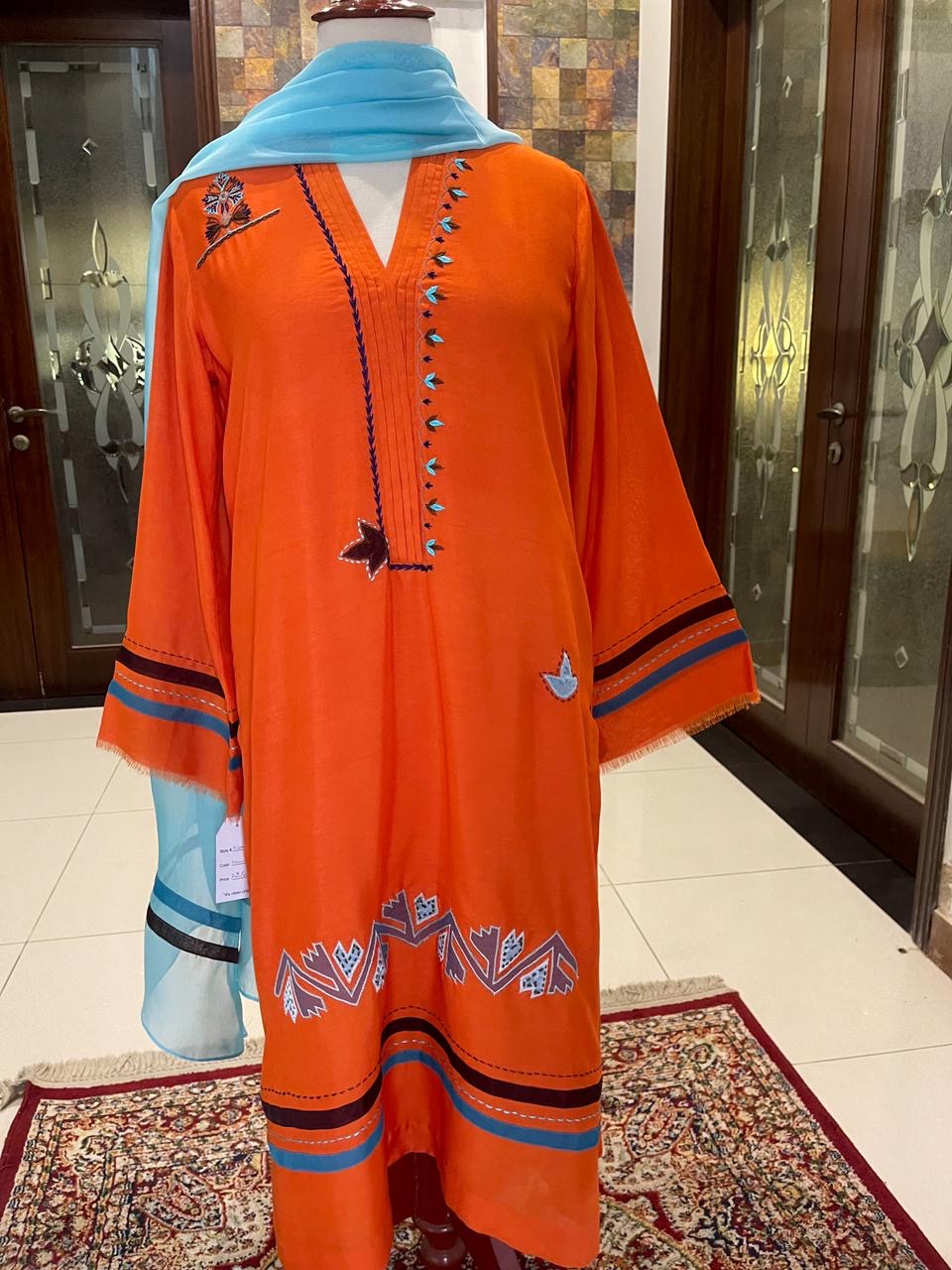 Introducing the Komal style ensemble, crafted from luxurious Khaddi Silk, paired with a delicate Silk Organza dupatta. This exquisite piece features intricate appliqué work with organza and velvet on the shirt, complemented by stunning resham embroidery along the neckline. The addition of chawal tanka details elevates the design, making it a true statement piece for any occasion.