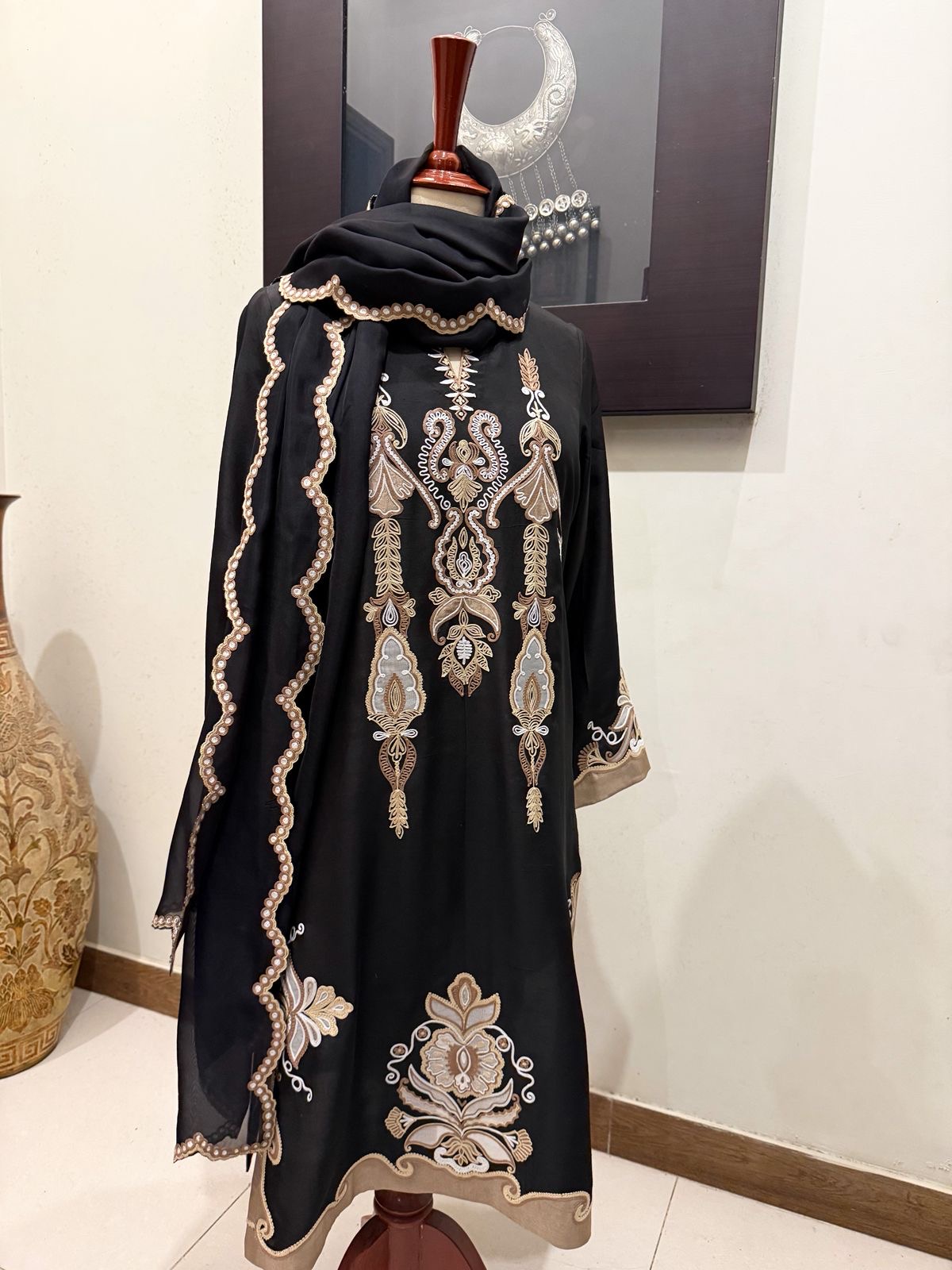 Styled in pure Raw Silk, Komal carries the quiet glow of refined luxury. The outfit is adorned with intricate arri detailing and thoughtful appliqué work that adds depth without excess. It’s a piece crafted to elevate your evening, offering a poised, graceful presence that lingers long after you’ve left the room.