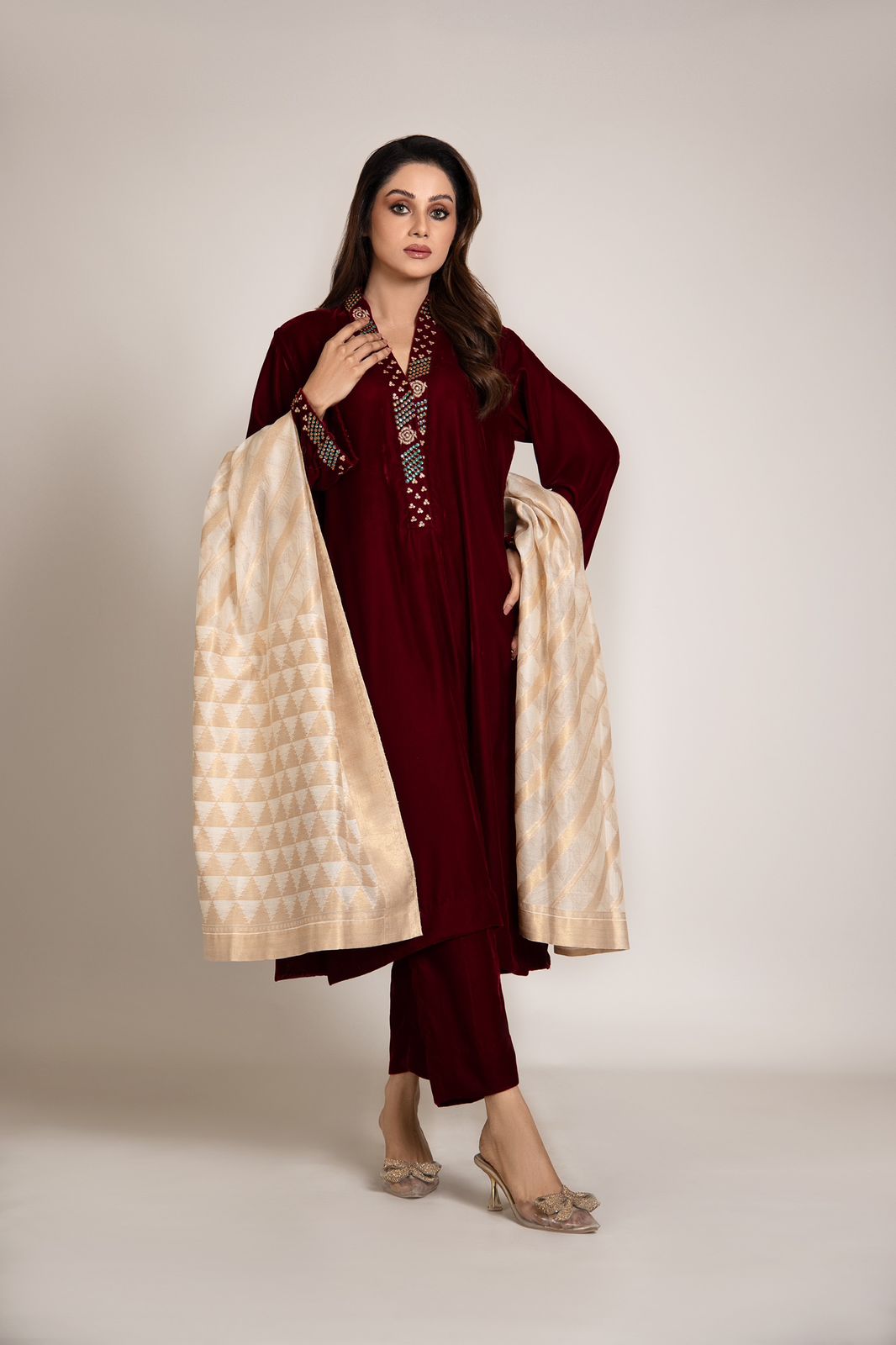 Previous Product Next Product Ronak ₨ 24,500 Size Choose an optionSmallMediumLargeCustom OrderSmallMediumLargeCustom OrderClear Ronak quantity Add to cart SKU: N/A Categories: New Arrivals, Occasion Wear, Pret Wear Tag: New Arrival Size ChartsAll Sizes Description Additional information Description Hand embroidery done on velvet shirt. With matching pants. Additional information Size Small, Medium, Large, Custom Order Opens in a new window Tweet This Product Opens in a new window Share on Facebook Opens in a new window Pin This Product Opens in a new window Mail This Product Related products Quick View Quick View Pret WearGulabi ₨ 15,500 Select options This product has multiple variants. The options may be chosen on the product page Quick View Quick View Daily Wear, Pret WearAmal ₨ 12,500 Select options This product has multiple variants. The options may be chosen on the product page