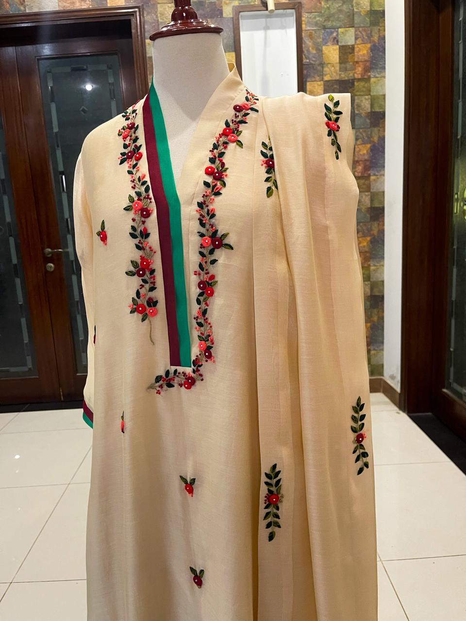 Intricate handcrafted outfit with resham and anchor work finished with pearls and Organza